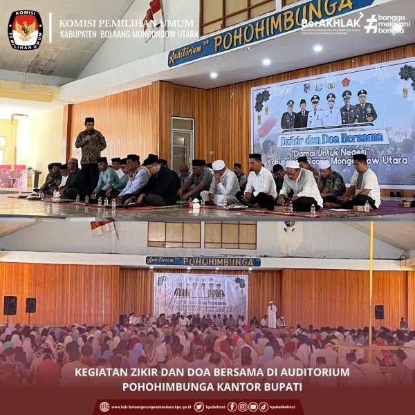 Kamis, 4 September 2025, Ketua Komisi Pemilihan Umum (KPU) Kabupaten Bolaang Mongondow Utara menghadiri kegiatan Zikir dan Doa Bersama untuk Kedamaian Negeri yang digelar oleh Pemerintah Daerah Kabupaten Bolaang Mongondow Utara Kegiatan ini menjadi momentum penting bagi seluruh elemen masyarakat untuk berkumpul dan memanjatkan doa demi keselamatan serta kedamaian bangsa Indonesia. Turut hadir dalam kegiatan tersebut Bupati Bolaang Mongondow Utara, Wakil Bupati, jajaran Aparatur Sipil Negara (ASN), serta masyarakat dari berbagai kalangan. Pelaksanaan doa bersama dilakukan secara serentak di dua lokasi berbeda. Untuk umat Islam, kegiatan dipusatkan di Auditorium Pohohimbungan Kantor Bupati, sementara bagi umat Kristiani, doa bersama berlangsung di Aula DPRD Kabupaten Bolaang Mongondow Utara. Hal ini menunjukkan semangat kebersamaan serta toleransi antarumat beragama di daerah, yang selalu mengedepankan persatuan dalam keberagaman. Melalui kegiatan ini, seluruh peserta memanjatkan doa agar bangsa dan negara Indonesia senantiasa diberikan kedamaian, keselamatan, keberkahan, serta terhindar dari segala bentuk perpecahan. Doa bersama juga menjadi wujud nyata kebersamaan pemerintah dan masyarakat dalam menjaga kerukunan serta mempererat rasa persaudaraan. ....