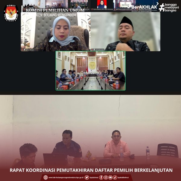Selasa, 9 September 2025, Komisi Pemilihan Umum (KPU) Kabupaten Bolaang Mongondow Utara melalui Divisi Perencanaan dan Data mengikuti Rapat Koordinasi Pemutakhiran Daftar Pemilih Berkelanjutan (PDPB) yang diselenggarakan oleh KPU Republik Indonesia melalui Pusat Data dan Informasi. Kegiatan ini diikuti oleh seluruh KPU Provinsi/KIP Aceh serta KPU Kabupaten/Kota di seluruh Indonesia secara serentak. Rapat koordinasi dibuka langsung oleh Ketua KPU Republik Indonesia, Mochammad Afifuddin, dan dihadiri oleh Betty Epsilon Idroos, selaku Ketua Divisi Perencanaan, Data, dan Informasi KPU RI. Dalam arahannya, Ketua KPU RI menegaskan pentingnya konsistensi dan akurasi data pemilih sebagai bagian dari upaya menjaga kualitas demokrasi. Sementara itu, Betty Idroos menyampaikan materi terkait penetapan rekapitulasi PDPB Triwulan III yang menjadi pokok pembahasan dalam rapat koordinasi tersebut. Melalui kegiatan ini, diharapkan KPU di seluruh tingkatan dapat menyelaraskan pemahaman sekaligus memperkuat sinergi dalam pemutakhiran daftar pemilih, sehingga terwujud data pemilih yang mutakhir, akurat, dan dapat dipertanggungjawabkan. ....