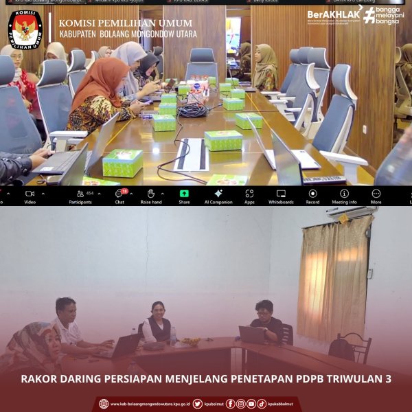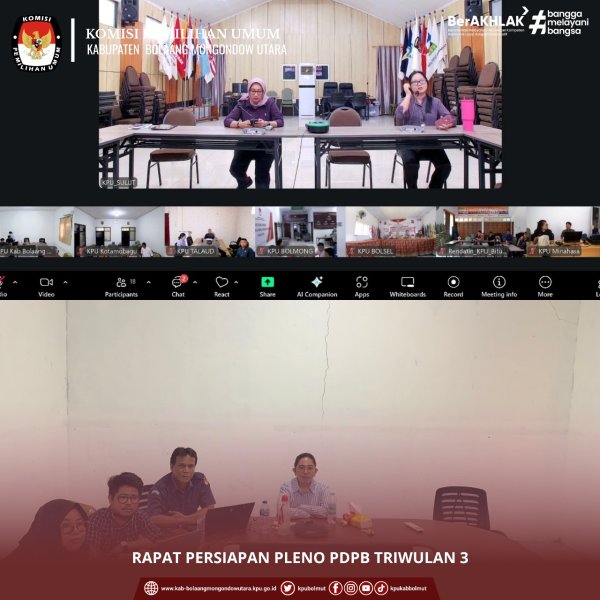 Bolaang Mongondow Utara – Pada Selasa, 30 September 2025, Komisi Pemilihan Umum (KPU) Kabupaten Bolaang Mongondow Utara mengikuti *Rapat Persiapan Pleno Pemutakhiran Data Pemilih Berkelanjutan (PDPB) Triwulan III* yang diselenggarakan oleh KPU Provinsi Sulawesi Utara. Kegiatan yang dilaksanakan secara daring ini diikuti oleh Ketua Divisi Perencanaan, Data dan Informasi KPU Bolmut, Kasubbag Perencanaan, Data dan Informasi, serta admin/ operator Sidalih. Rapat koordinasi tersebut dipimpin langsung oleh Ibu Lanny Ointu selaku Ketua Divisi Perencanaan, Data dan Informasi KPU Provinsi Sulawesi Utara. Dalam rapat ini, dibahas berbagai persiapan teknis dan administratif yang berkaitan dengan pelaksanaan Pleno PDPB Triwulan III, termasuk tahapan penyusunan data, proses verifikasi, hingga mekanisme pelaporan. Diskusi berlangsung interaktif dengan menekankan pentingnya ketelitian serta sinkronisasi data demi memastikan akurasi daftar pemilih berkelanjutan. Rapat persiapan ini menjadi langkah strategis sebelum dilaksanakannya *Pleno PDPB Triwulan III pada Kamis, 2 Oktober 2025*, yang diharapkan dapat menghasilkan data pemilih yang mutakhir, akurat, dan dapat dipertanggungjawabkan sebagai bagian dari upaya menjaga kualitas penyelenggaraan pemilu di tingkat daerah maupun nasional. ....