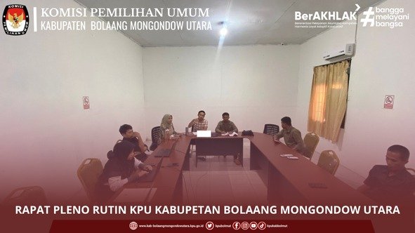 Rabu, 19 November 2025 KPU Kabupaten Bolaang Mongondow Utara melaksanakan Rapat Pleno Rutin yang diikuti oleh seluruh komisioner dan jajaran sekretariat. Rapat ini digelar sebagai bagian dari agenda evaluasi mingguan serta penyusunan rencana kerja untuk minggu berikutnya.