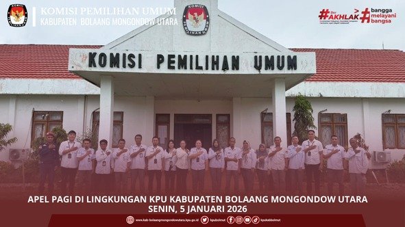 Bolaang Mongondow Utara, Senin (5/1/2026) — Komisi Pemilihan Umum (KPU) Kabupaten Bolaang Mongondow Utara melaksanakan apel pagi pada Senin, 5 Januari 2026, bertempat di halaman Kantor KPU Kabupaten Bolaang Mongondow Utara.