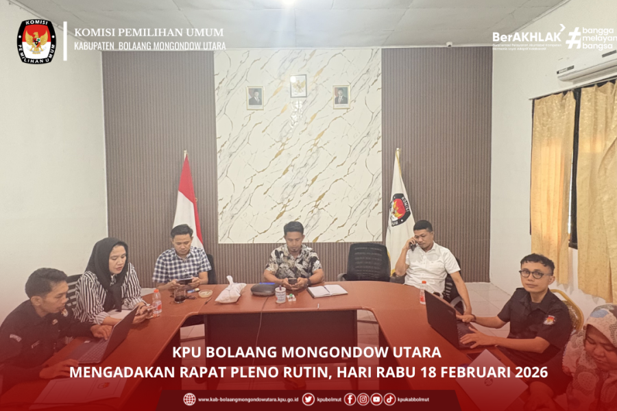 Bolaang Mongondow Utara, 18 Februari 2026 — Komisi Pemilihan Umum Kabupaten Bolaang Mongondow Utara menggelar Rapat Pleno Rutin pada Rabu (18/02) yang bertempat di Media Center KPU Kabupaten Bolaang Mongondow Utara. Kegiatan ini merupakan agenda berkala dalam rangka memperkuat koordinasi internal serta memastikan seluruh pelaksanaan tugas dan fungsi kelembagaan berjalan efektif dan sesuai dengan perencanaan yang telah ditetapkan.
