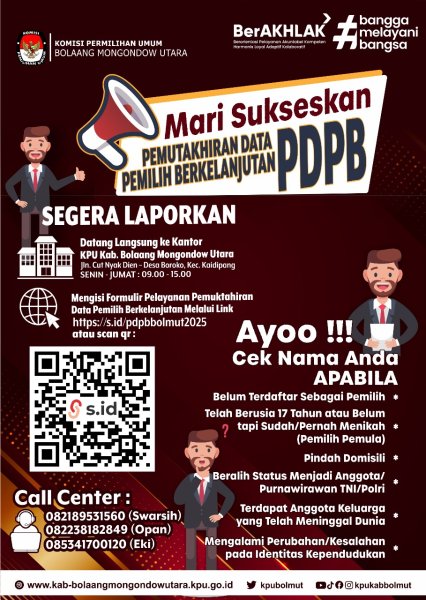 Apabila terdapat hal-hal yang ingin ditanyakan seputar pelayanan PDPB, silakan menghubungi Call Center KPU Kabupaten Bolaang Mongondow Utara melalui kontak resmi yang tersedia.