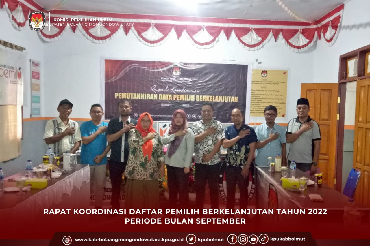 Boroko, kab-bolaangmongondowutara.kpu.go.id - Pemilih, Jumat 02 September 2022,Bertempat di Kantor KPU Kabupaten Bolaang Mongondow Utara, Pukul 15.40 Wita, KPU Kabupaten Bolaang Mongondow Utara Melakasanakan Rapat Pleno Rekappitulasi Daftar Pemilih Berkelanjutan Tahun 2022 di tingkat Kabupaten Bolaang Mongondow Utara. Berdasarkan ketentuan Peraturan Komisi Pemilihan Umum Nomor 6 Tahun 2021 Tentang Pemutahiran Data Pemilih Berjelanjutan, Hasil Rekapitulasi Daftar Pemilih Berkelanjutan KPU Kabupaten Bolaang Mongondow Utara menghasilkan hal sebagai berikut: Rekapitulasi Daftar Pemilih Berkelanjutan dengan jumlah sebanyak 60.114 (enam Puluh ribu seratus empat Belas ) pemilih dengan rincian pemilih laki-laki berjumlah 30.699 (Tiga puluh ribu enam ratus sembilang puluh sembilang) pemilih dan pemilih perempuan berjumlah 29.415 (dua puluh sembilan ribu empat ratus lima belas) pemilih, terseber di 6 (enam) Kecamatan, 107 ( seratus tujuh) Desa/Kelurahan, 263 ( dua ratus enam puluh tiga ) TPS yang ada di Kab.Bolaang Mongondow Utara. Kegiatan yang dilakasanakan setiap bulan dibuka oleh Ketua KPU Kab Bolmut Djunaidi Harundja dan dihadiri oleh Komisioner KPU Kab.Bolaang Mongondow Utara.