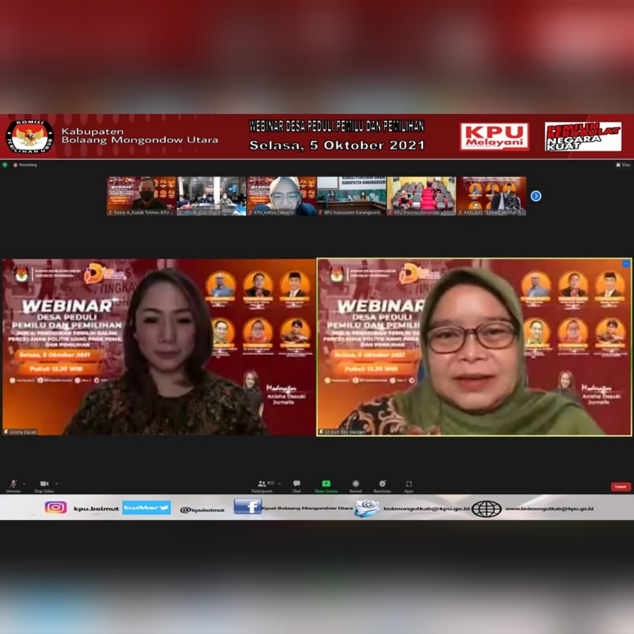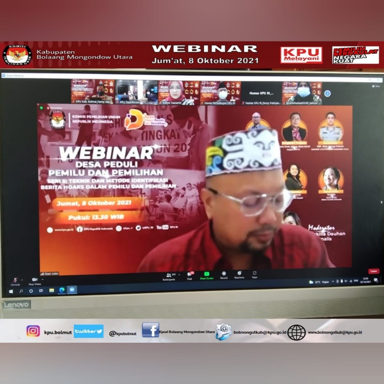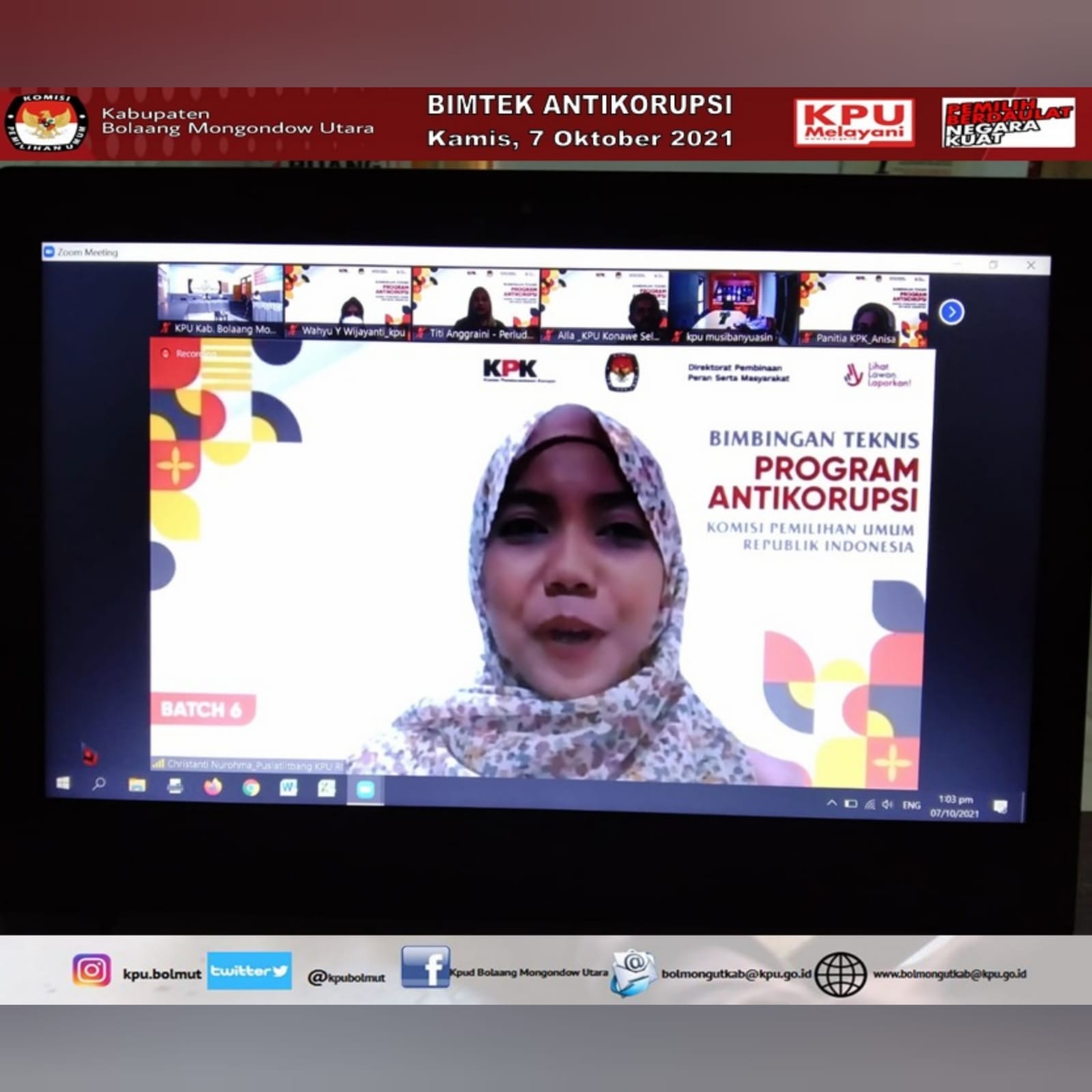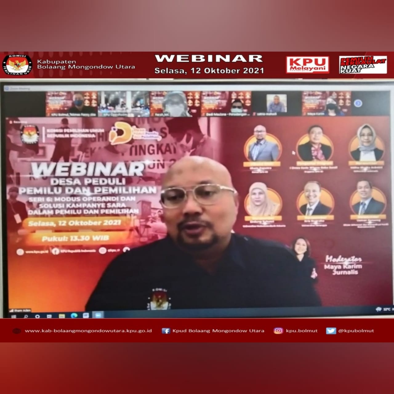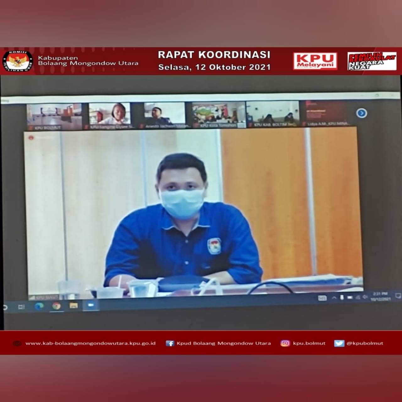 #TemanPemilih, KPU Kab. Bolaang Mongondow Utara (KPU Bolmut) mengikuti kegiatan Rapat Kooordinasi Tindak Lanjut Surat 776 terkait Penggunaan Email Resmi KPU RI dan Pemetaan Pemilih Pindah antar Kabupaten/Kota, Selasa (12/10) mulai pukul 14.00 WITA. Adapun peserta dalam Kegiatan ini adalah Ketua, Ketua Divisi Perencanaan, Data dan Informasi, Sekretaris, Kepala Sub bagian Perencanaan, Data dan Informasi serta Operator Sidalih yang ada di 15 KPU Kabupaten/Kota di Provinsi Sulawesi Utara. Kegiatan dibuka langsung oleh Ketua KPU Provinsi Sulawesi Utara, Ardiles Mewoh. Kegiatan yang dilaksanakan secara daring ini lewat aplikasi Zoom bertujuan agar masing-masing KPU Kabupaten/Kota lebih aktif lagi dalam menggunakan website yang telah ada dimasing-masing Kabupaten/Kota untuk mempermudah penyajian informasi kepada publik, serta dalam melaksanakan Pemetaan TPS masing-masing Kabupaten/Kota agar memperhatikan secara Detail Pemilih yang Pindah dari Kabupaten/Kota yang lain tegas Ketua Divisi Perencanaan, Data dan Informasi KPU Provinsi Sulawesi Utara, Lani Ointu dalam arahannya. Kegiatan ini dihadiri juga oleh Ketua Divisi Teknis Penyelenggaraan KPU Provinsi Sulawesi Utara, Yessy Momongan yang juga turut memberikan arahan, serta Ketua Divisi Sosialisasi dan Partisipasi Pendidikan Pemilih KPU Provinsi Sulawesi Utara, Salman Saelangi. #KPUMelayani