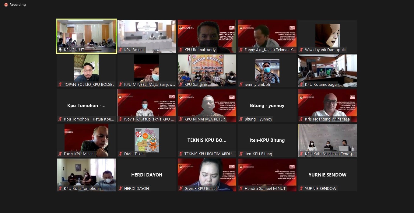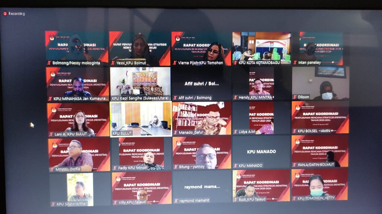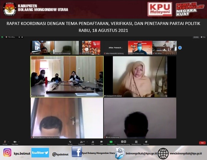 #TemanPemilih, Selasa, 31 Agustus 2021 KPU Kabupaten Bolaang Mongondow Utara (KPU Bolmut) mengikuti Rapat Koordinasi Pemutakhiran Data Pemilih Berkelanjutan bulan Agustus 2021 yang dilaksanakan oleh KPU Provinsi Sulawesi Utara. Kegiatan ini dilaksanakan secara Online lewat Aplikasi Zoom, adapun peserta rapat adalah 15 KPU Kabupaten/Kota yang ada di Provinsi Sulawesi Utara dan untuk KPU Bolmut diwakili oleh Ketua Divisi Perencanaan, Data dan Informasi, Irfan F. Awumbas, Kepala Subbagian Perencanaan, Data dan Informasi, Yessi Z.S Mentang serta Operator Sidalih, Syaopansah Winata. Kegiatan ini dibuka oleh Ketua KPU Provinsi Sulawesi Utara, DR. Ardiles Mewoh dan dihadiri oleh seluruh Komisioner KPU Provinsi Sulawesi Utara yaitu Lani Ointu Ketua Divisi Perencanaan, Data dan Informasi, Yessy Momongan, S.TH, Ketua Divisi Teknis, Salman Saelangi Ketua Divisi Sosialisasi dan Partisipasi Pendidikan Pemilih serta Meydi Tinangon Ketua Divisi Hukum, Pengawasan dan SDM serta dari Sekretariat KPU Provinsi Sulawesi Utara Kepala Bagian Perencanaan dan SDM, Raymond Mamahit serta Kepala Subbagian Perencanaan Data dan Informasi, Lani Alou. Tujuan dari Rapat ini untuk memastikan setiap Pemutakhiran Data Pemilih Berkelanjutan dimasing - masing Kab/Kota berjalan dengan baik meski dimasa pandemi.