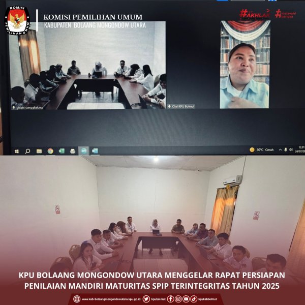 Dalam rangka memperkuat tata kelola organisasi dan memastikan tercapainya standar akuntabilitas kinerja, Komisi Pemilihan Umum (KPU) Kabupaten Bolaang Mongondow Utara (Bolmut) menggelar rapat internal tim asesor untuk mempersiapkan Penilaian Mandiri Maturitas Sistem Pengendalian Intern Pemerintah (SPIP) tahun 2025.