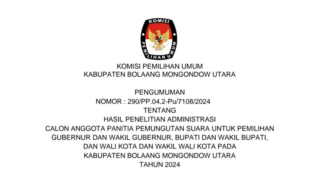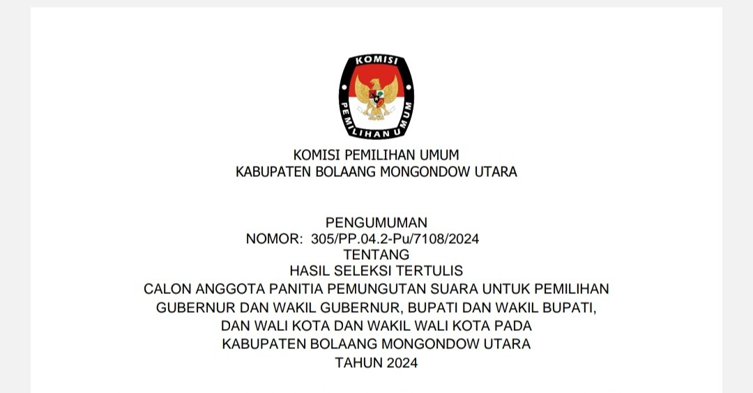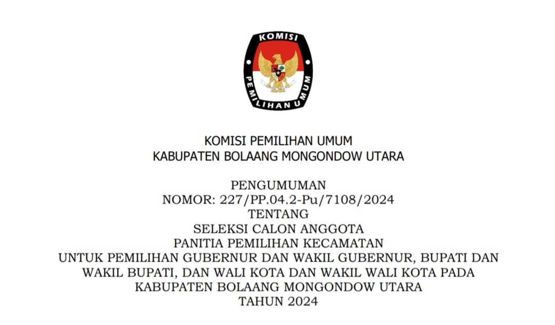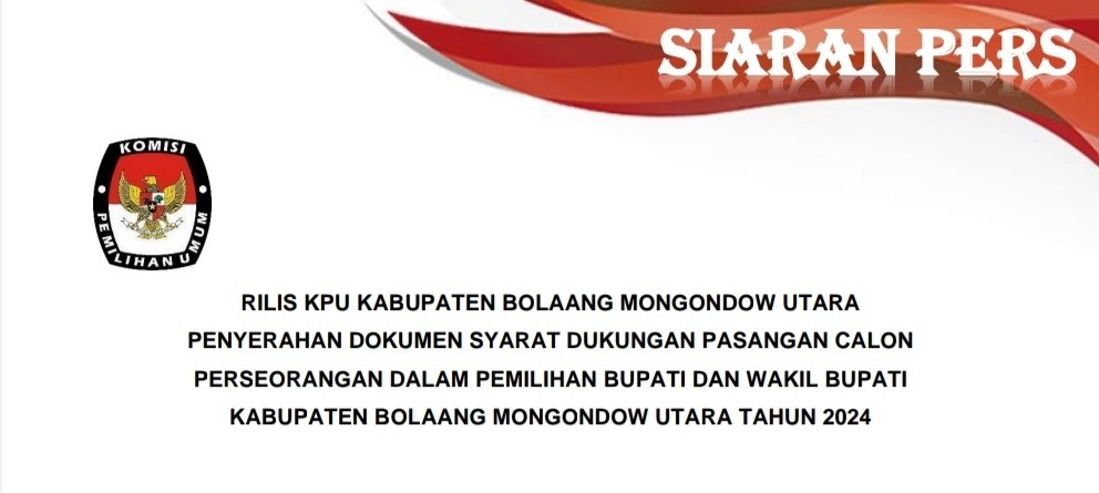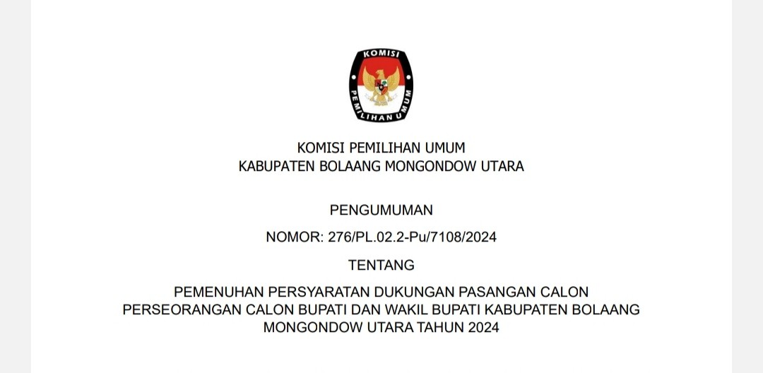 Komisi Pemilihan Umum (KPU) Kabupaten Bolaang Mongondow Utara telah mengumumkan tentang syarat Calon Perseorangan Pemilihan Bupati dan Wakil Bupati Tahun 2024.