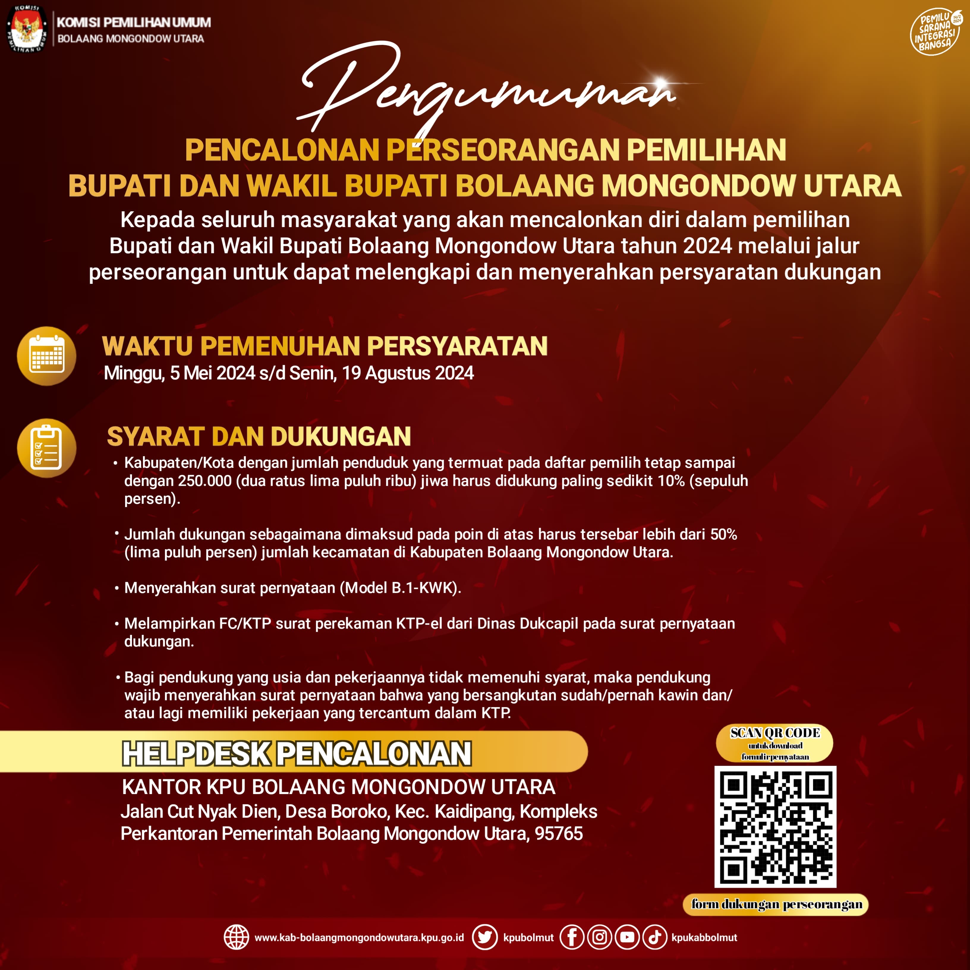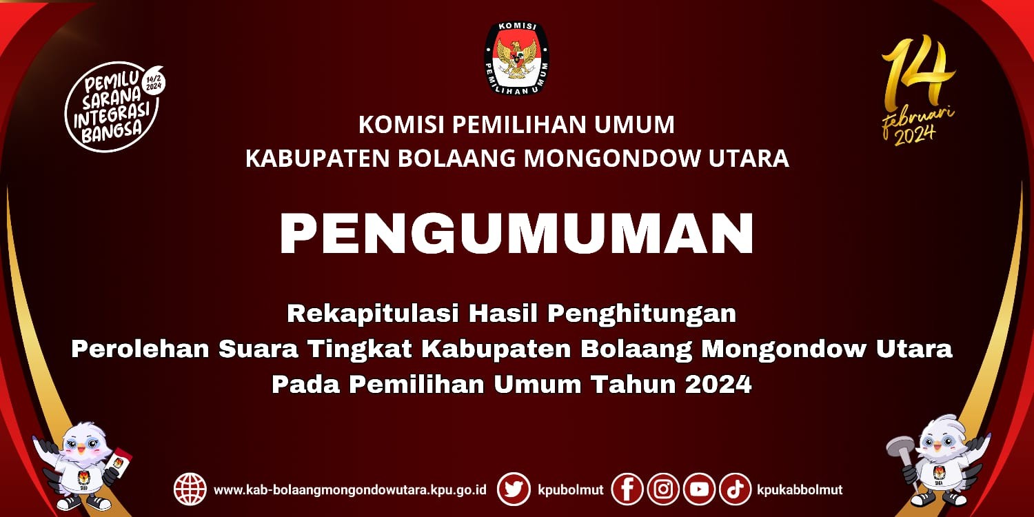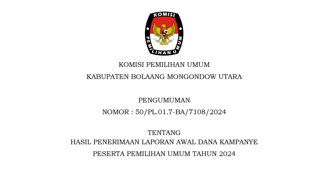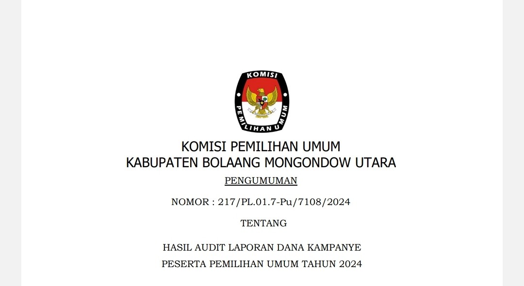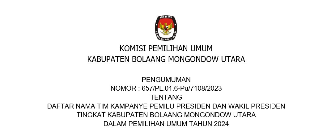 BOLMUT - Bahwa untuk melaksanakan ketentuan Pasal 12 Peraturan Komisi Pemilihan Umum Nomor 15 Tahun 2023 tentang Kampanye Pemilihan Umum, KPU Kabupaten Bolaang Mongondow Utara mengumumkan Daftar Nama Tim Kampanye Pemilu Presiden dan Wakil Presiden Tingkat Kabupaten Bolaang Mongondow Utara dalam Pemilihan Umum Tahun 2024. Selengkapnya disini
